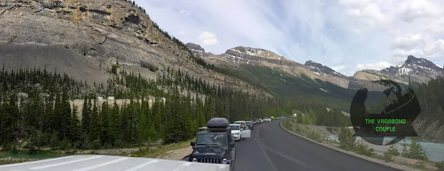 Further along, the Weeping Wall, a sheer rock face with cascading waterfalls, was a showstopper. We then came up on the Big Bend on Icefields Parkway - a dramatic, spiraling stretch of road that feels like a masterpiece of mountain engineering. Situated near Big Bend Peak and just before the cascading beauty of Panther Falls, this sweeping loop ascends sharply as it hugs the contours of the rugged terrain.