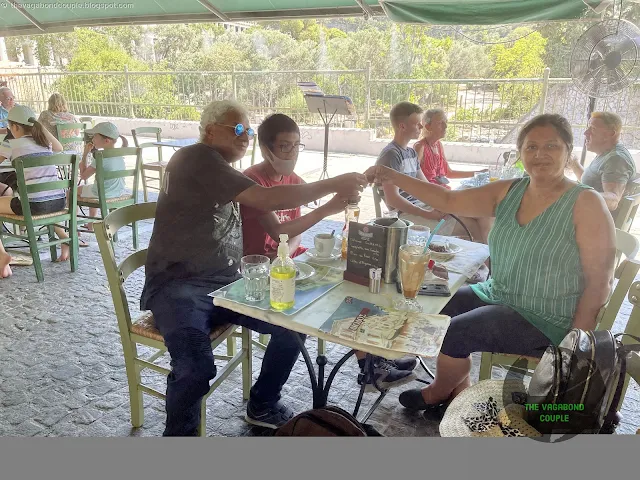 It is intensely hot in Athens today (the Agora was closed to visitors a couple of days earlier due to the record heat). We exit the Agora and gladly sit down in the water mist from fans in one of the restaurants lining Adrianou Street across the gate to the Ancient Agora. Adrianou Street, running alongside the Ancient Agora of Athens, is a captivating blend of historical significance and modern charm. This street, one of the oldest in Athens, offers a unique vantage point to appreciate the city's ancient and contemporary landscapes.