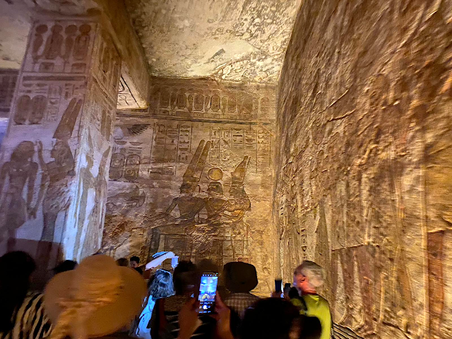 Four colossal 66-foot statues of Ramesses the Great sitting on thrones staring down at us welcome us as we approach the Great Temple. The sheer scale of the monument has the intended effect and much more. (Pieces of one statue that broke off in an earthquake, including the huge head and crown, are on the ground exactly at the positions they were at before the big move.)
